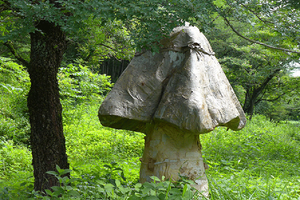 小砂の皆さんと共同制作により、ダンボールだけで作られた作品です。 四季折々の森の変化と共に作品も徐々に変化して行きます。 木を原料とするダンボールが風雨で崩れ、虫や動物が住み着きいずれは朽ちて森に還る。 森の資源からできた人工物が芸術を通して、森に返される。 これは新たな再生の形ではないでしょうか。 環境と芸術の新たな試みを小砂から始めます。