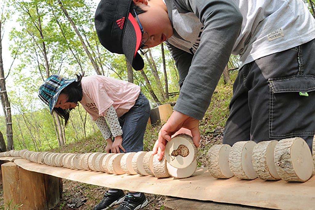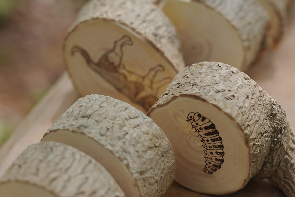 イチョウは中生代から新生代にかけて中国から世界に広がった古い品種である。 小砂で育ったイチョウの木の小口部分には90種類の絵が彫られている。 それら凹版になっていて、紙粘土で絵をレリーフ状に写し取ることができ、たくさんの生き物が生まれていく。 そして最後はまた1本の木に還っていく。 その循環はどこまでもどこまでも続く。