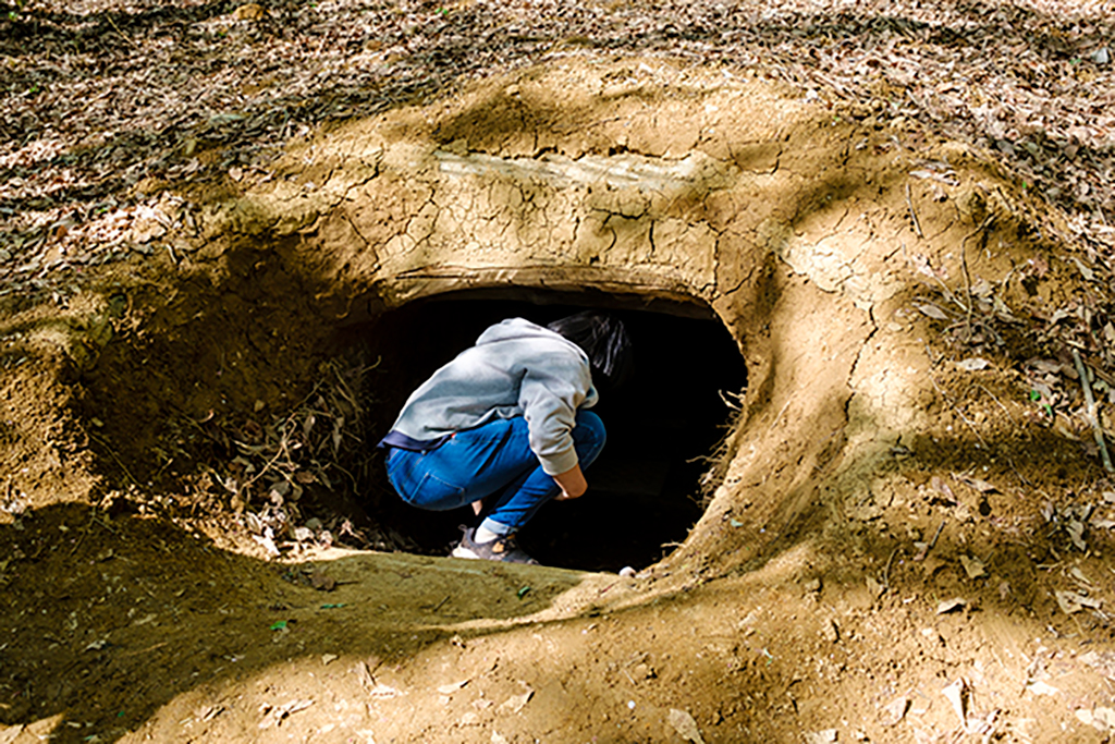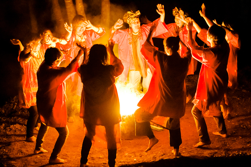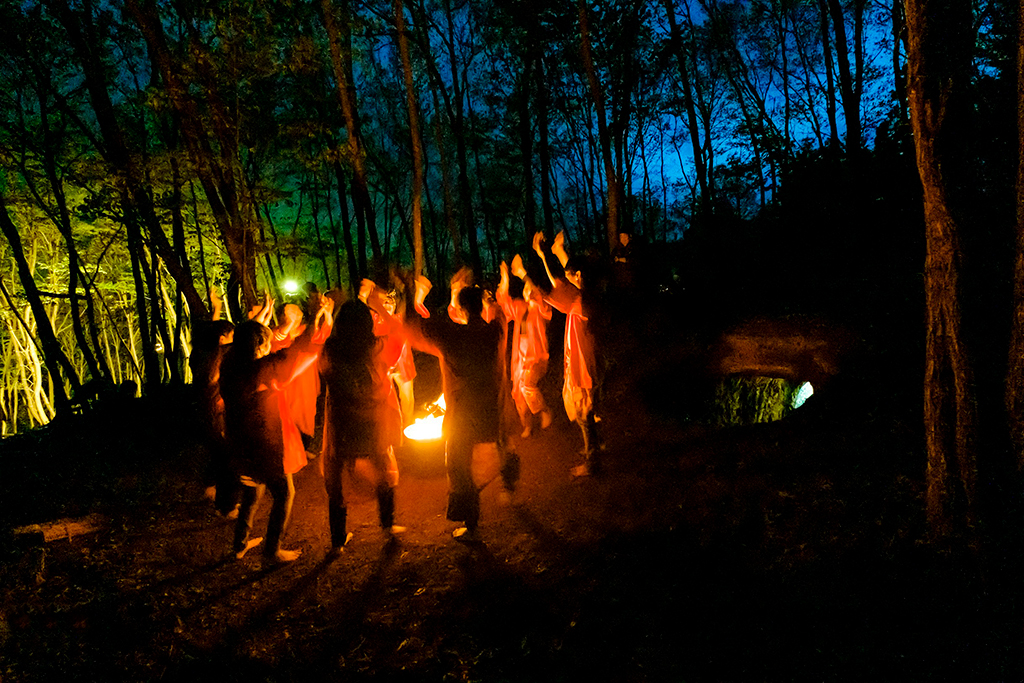 それは土の中にあります。土を深さ5メートルは掘っていって、横に10メートルは進みます。掘っていくとそこにある居場所が出来てきました。明かりがないから、火を灯します。何か書き留めるための机を用意します。火を灯し机を置いた、残り少ない面積を大きく使って、土の上を耕したら、白でマークを残します。なぜマークを残すのか、そのマークの意味は何か、今のところは不明です。その地上では、焚き火を起こし、5〜10名くらいで踊りを踊っています。踊りの様子は薄らぼんやりとしているのですが、そこに居合わせる人たちの中で、正気の沙汰ではない人がちらほらいます。無理やり参加をさせられた人も何人かはいます。夜に決行します。輪をつくって踊る人たちは、お互いにわかり合うこと、共に生きていくこと、分かり合えない他者同士が、より良い社会をつくるために、意図的にそのようなことを意識して踊ります。
